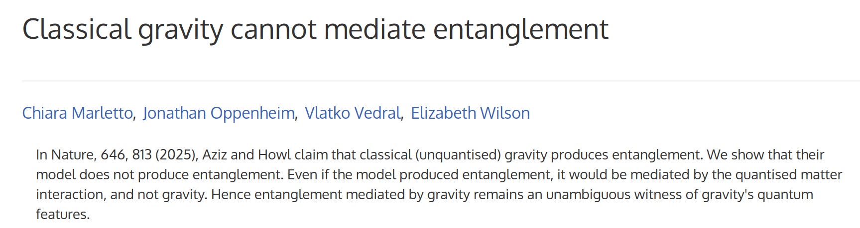 Another day, another arxiv paper claiming that classical gravity can produce entanglement https://arxiv.org/abs/2510.23584. And also claiming the reason this is possible is that the Newtonian interaction is a non-local direct coupling between the two masses. But this is clearly false because the definition of entanglement is that it can't be created by classical communication, and you can imagine that classical communication instantaneously couples the two masses. If a classical field is mediated an interaction, and you integrate it out, then the coupling between the two masses is a convex sum of product unitaries U^A U^B on that state, and this can't create entanglement. Zach Weller-Davies and I specifically point out that locality has nothing to do with whether a classical field can mediate entanglement in our proof in htttps://arxiv.org/abs/2302.07283. The reason that some researchers are claiming that their interaction creates entanglement, is because the interaction they write down doesn't come from a classical theory. If you integrate out the quantum Coulumb field to get a 1/|x-y| potential which couples quantumly to the position of the charges, then yes, this interaction creates entanglement, but it doesn't come from a classical field theory, it comes from a quantum one (e.g. QED).