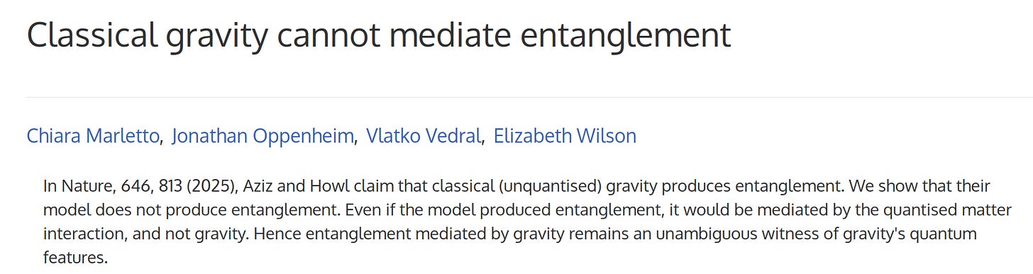 After this post appeared, Elizabeth Wilson and I teamed up with up with Chiara Marletto, and Vlatko Vedral (who wrote an overlapping analysis at the same time as this blog post), to put together this comment: https://arxiv.org/abs/2511.07348 We show that their model does not produce entanglement. Even if the model produced entanglement, it would be mediated by the quantised matter interaction, and not gravity.
